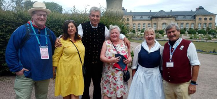 Another partnership-building highlight in Gotha showing how cultural bridges are being constructed amongst all the dances and parades, was the DGV and TDFS joint meeting with the President of the International Europeade Committee Rüdiger Heß (pictured below in the centre) while planning how together we can enable the first-ever Europeade tour to the UK in 2025.